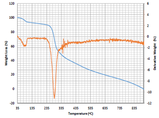 Fig. 1: TG/DTG curves for Schiff base, HL1: N'-{(E)-[4-(diethylamino)-2-hydroxyphenyl] methylidene}-4-nitrobenzohydrazide