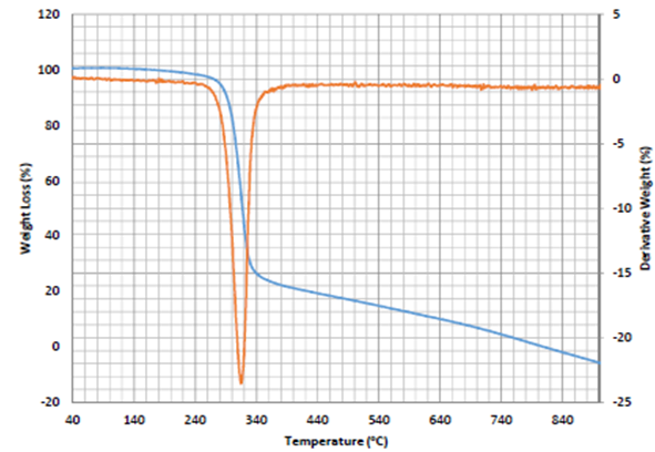 Fig. 3: TG/DTG curves for Mn(acac)(L1): Manganese acetylacetonato(N'-{(E)-[4-(diethylamino)-2-hydroxyphenyl]methylidene}-4-methoxybenzohydrazide)