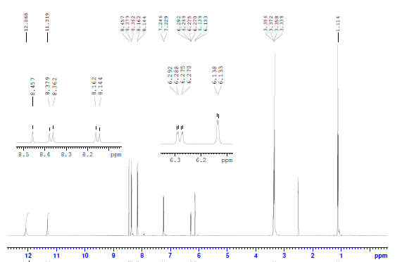 Fig. 5: Proton NMR for Schiff base, HL1: N'-{(E)-[4-(diethylamino)-2-hydroxyphenyl] methylidene}-4-nitrobenzohydrazide