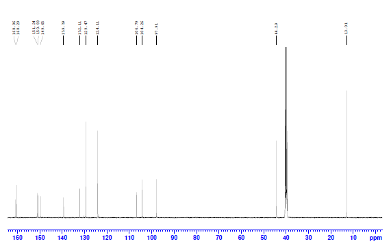 Similarly, 1H NMR spectrum of Schiff base (HL2) show some signals at δ 11.76 ppm (1H, s) that is attributed to the phenolic proton. While the signal due to the NH group appeared at δ 11.27 ppm (1H, s), azomethine proton (–HC=N) at δ 8.43 ppm (1H, s), aromatic protons at δ 7.50 (1H, d), δ 7.42 (1H, d), δ 7.20 (1H, d) ppm. Many signals appearing as multiplets in the δ 6.26-7.18 ppm region are due to the aromatic protons, methoxy proton 3.84 (3H, s) ppm, methylene protons at the range δ 3.33-3.38 ppm (multiplets), methyl protons at 1.11(3H, t) ppm (fig. 7). In the 13C NMR spectrum, the signal of 162.41 ppm is due to the phenolic carbon, amide carbon at δ 160.2 ppm, δ 159.7 ppm (C=N) is due to carbon atom in the azomethine groups, aromatic carbons at δ 150.6, 150.4, 136.0, 132.0, 130.5, 120.1, 119.0, 113.2, 108.6, 104.1 ppm, methoxy carbon at 97.4 ppm, methylene carbon appeared at 55.3 and 44.3 ppm, methyl carbon at δ 13.02 ppm (fig. 8) [4, 14, 17].