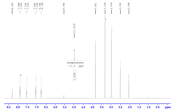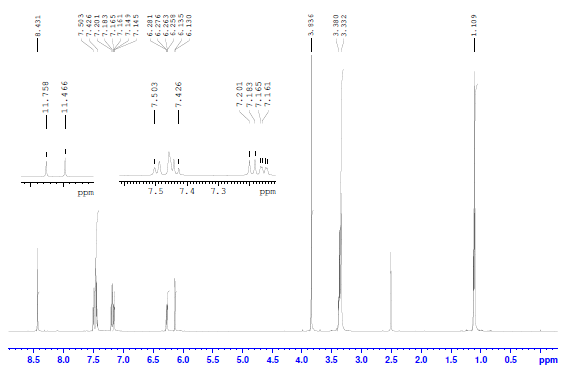 Fig. 7: Proton NMR for Schiff base, HL2: N'-{(E)-[4-(diethylamino)-2-hydroxyphenyl] methylidene}-4-methoxybenzohydrazide