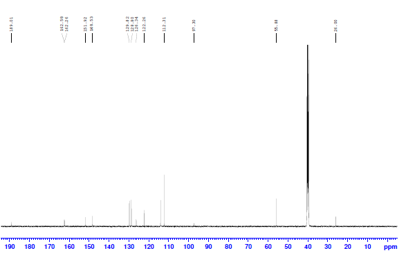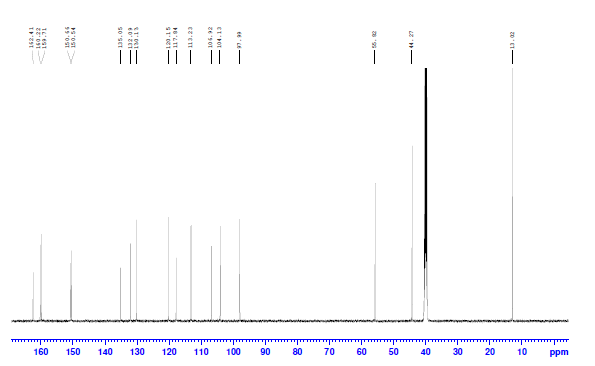 Fig. 8: Carbon-13 NMR for Schiff base, HL2: N'-{(E)-[4-(diethylamino)-2-hydroxyphenyl] methylidene}-4-methoxybenzohydrazide
