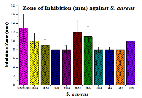 Fig. 11: Zone of Inhibition of manganese complex against Staphylococcus aureus, Mn(acac)(L2)-Manganese acetylacetonato(N'-{(E)-[4-(diethylamino)-2-hydroxyphenyl]methylidene}-4-methoxybenzohydrazide); mm-millimetre; S. aureus-Staphylococcus aureus; (ATCC 25923)-S. aureus; (1RO4)-S. aureus; (1RO6)-S. aureus; (1RO9)-S. aureus; (2RO4)-S. aureus; (2RO5)-S. aureus; (3RO6)-S. aureus; (3RO9)-S. aureus; (4R4)-S. aureus; (4R5)-S. aureus and (15Z1)-S. aureus, n = 3, X±SEM