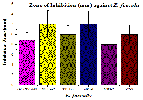 Fig. 12: Zone of Inhibition of manganese complex against Enterococcus faecalis, Mn(acac)(L2)-Manganese acetylacetonato(N'-{(E)-[4-(diethylamino)-2-hydroxyphenyl]methylidene}-4-methoxybenzohydrazide); mm-millimetre; E. faecalis-Enterococcus faecalis; (ATCC 6569)-E. faecalis; (DEEL4-2)-E. faecalis; (STL1-3)-E. faecalis; (MP3-1)-E. faecalis; (MP3-2)-E. faecalis and (V2-2)-E. faecalis, n = 3, X±SEM