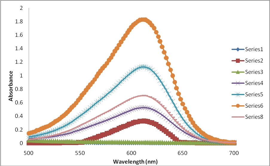 Method B: The same method above was performed as in method A except using 1ml of 1200 µg/ml NBS solution as oxidant and 3.0 ml of 200 µg/ml of (IC) dye solutions were used, the absorbance of the final solutions were measured at (610 nm). For the two methods a proportional increase in the absorbance for the two dyes is observed with increasing concentration of (TDF) which is obvious in (Fig. 2 and Fig. 3).