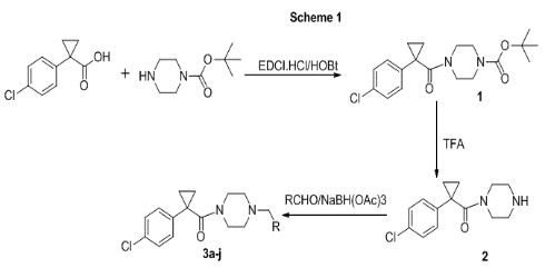 Methods: A series of new [1-(4-Chlorophenyl) cyclopropyl] (piperazin-1-yl) methanone derivates were synthesized using reductive amination method in presence of sodium triacetoxyborohydride to yield piperzine derivatives 3a-j. The structures of all newly synthesized compounds have been characterised by elemental analysis and spectral studies.