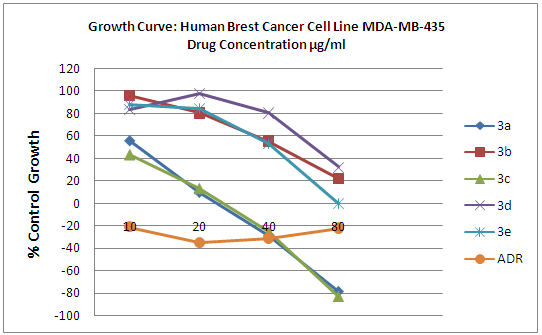 Five selected compounds have been screened for invitro anticancer activity against human breast cancer cell line MDA-MB-435 at 10, 20, 40 and 80 µG/mL concentration using sulforhodamine B assay method. The activity was carried out by Advanced Centre for Treatment, Research and Education in Cancer (ACTREC) Mumbai. Adriamycin (Doxorubicin) was used as positive control drug for comparing anticancer efficiency and DMSO as vehicle. Two compounds have been found to show dose dependent activity against breast cancer. The parameters GI50, TGI and LC50 have been reported. The results have been incorporated in Table 1 and diagram. Compounds 3a and 3c were found to show dose dependent activity.