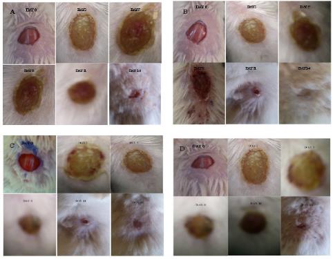 At first the mice were anaesthetized by open mask method using ether as anaesthetic agent [11]. Dorsal back of mice was depilated and ethyl alcohol (70%) was used as topical antiseptic for the depilated dorsal back before wound creation. An excision wound was carefully made by removing 7mm ×7 mm full thickness area from a predetermined area on each mice [12]. The excised wound was left undressed to the open environment and microbial agents were not at all used. Formulated gel and reference standard was applied once daily with sterilized spatula, which will take approximately same exact amount of gel. Application of formulated gel continued till 14 days, after termination of experiment, animals of all the groups treated with reference standard. During the experiment wounded animals were also documented photographically from fixed distance. The mice were distributed in groups and were placed in separate cages.