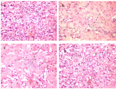 Fig. 3: Photomicrographs of hematoxylin and eosin stained sections of granulation tissue obtained from the animal wounds of,