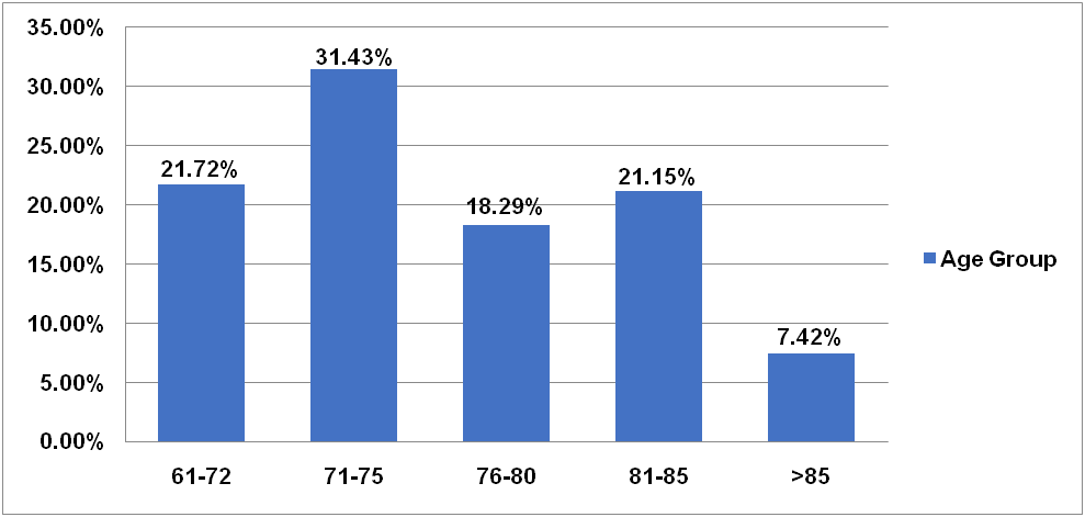 Among 175 patients, male (61.28%) predominance was observed in comparison to females (38.28%) as depicted in fig. 1. The majority of patients were in age group of 71-75 y (31.42%) followed by, 61-70 y (21.72%), 81-85 y (21.15%), and only 7.4% of age>85 y (fig. 2). 18.86% patients were illiterate and 32.0% were studied up to 12th. It was found that only 17.14% patients were employed and remaining was unemployed. The majority of the patients belong to lower middle class (40.58%) followed by the middle class (36.0%) as depicted in table 2.