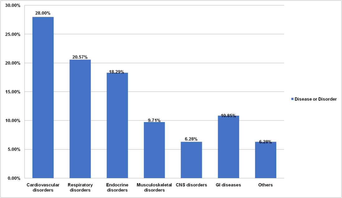 Among the study population, the prevalence of cardiovascular disorders (28.00%) was high followed by, respiratory disorders (20.57%), and endocrine disorders (18.29%) as depicted in fig. 3.