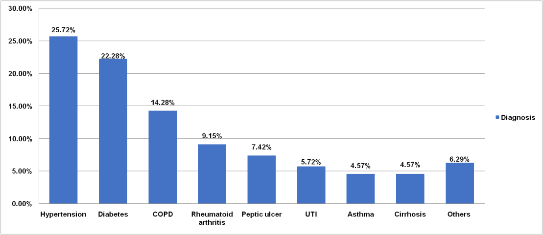 Hypertension (25.72%) was the most commonly diagnosed disease in the study the population followed by, diabetes (22.28%), chronic obstructive pulmonary disorder (14.28%) and cirrhosis (4.57%) was the less commonly diagnosed disease (fig. 4).