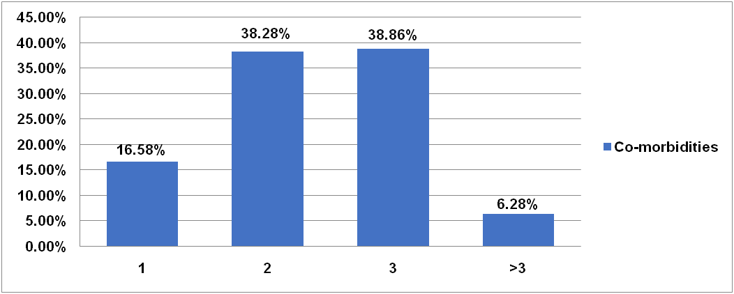 Majority of patients (38.86%) were found with 3 comorbidities (hypertension, diabetes mellitus, and chronic obstructive pulmonary disease), 38.28% patients were with 2 comorbidities and only 6.28% patients were with >3 comorbidities.