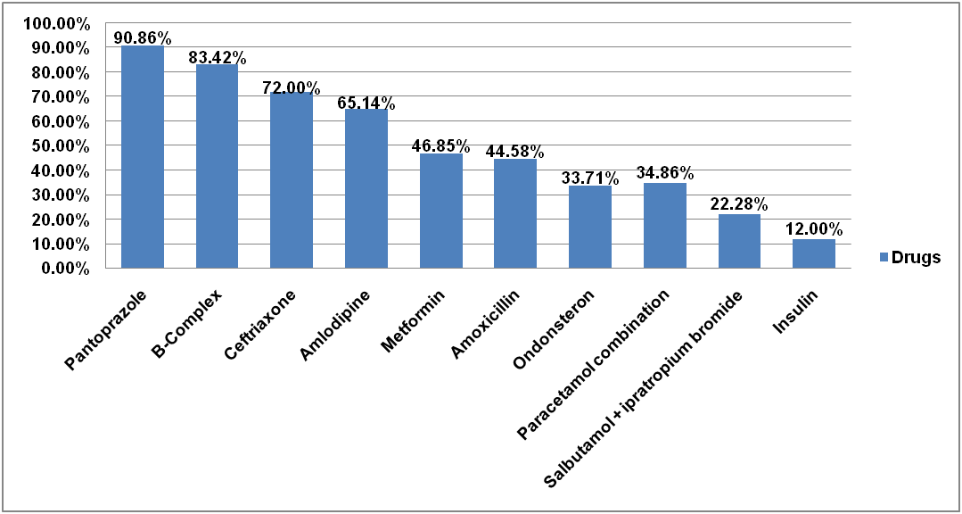 Among individual drug pantoprazole (90.86%) was found to most commonly prescribed drugs to the study population followed by B-Complex (83.42%). Among antibiotics, ceftriaxone and amoxicillin were frequently prescribed drugs. Among cardiovascular drugs, amlodipine was most commonly used drugs. Metformin in combination was most commonly prescribed to diabetic patients.