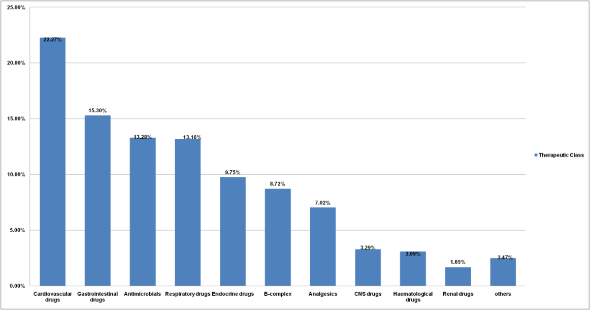 Cardiovascular drugs (22.27%) were most commonly prescribed drugs followed by gastrointestinal agents (15.30%) and antimicrobials (13.28%). A study conducted by Abraham et al. 2015 [18], reported that gastrointestinal drugs (17.28%) were frequently used followed by cardiovascular drugs (17.14%).
