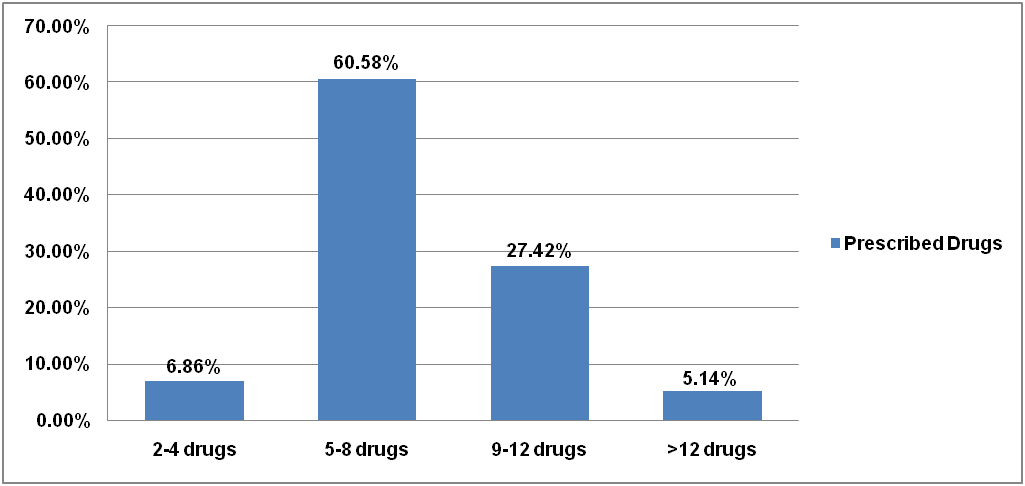 A total of 1581 drugs were prescribed to the study population with an average of 9.03 drugs per prescription. Prescriptions containing more than 5 drugs fall under the polypharmacy. In this study, 5-8 drugs were prescribed in 106 prescriptions, 9-12 drugs in 48 prescriptions and>12 drugs were prescribed in 9 prescriptions. These findings were similar to studies conducted by Babar et al. 2014 [24], Lourdu et al. 2014 [21] and Abraham et al. 2015 [18]. The prevalence of polypharmacy was higher in all the studies and it is due to the presence of multiple diseases. As per WHO, prescriptions containing more than 5 drugs are fall under the polypharmacy and it can be eliminated by stopping the use of unnecessary drugs and PIMs (potentially inappropriate drugs).