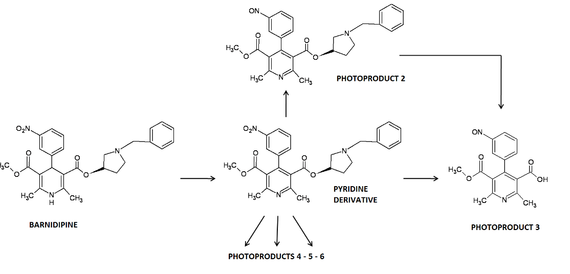 Barnidipine is a long-term DHP and its antihypertensive action is related to the reduction of peripheral vascular resistance secondary to its vasodilatory action [39]. An accurate study on the behavior of barnidipine when exposed to natural and stressing light irradiation was conducted, showing different photodegradation processes under these two light sources [40]. Kinetics of the process was determined by HPLC and spectrophotometry. Exposure of the drug to sunlight caused oxidation to give the pyridine derivative as the main photoproduct. In contrast, under stressing irradiation, a complex degradation pathway caused the formation of numerous by-products (fig. 2).