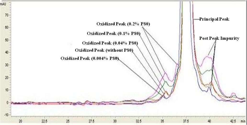 Fig. 1: Overlay chromatogram of RP-HPLC of drug product with different concentration of Polysorbate-80. The amount of oxidation as well as post peak impurity of G-CSF increases with respect to polysorbate-80 concentration.