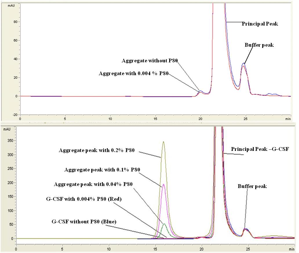 The main objective of our present study was to check the dual effect of Tween-80 concentration upon oxidation and aggregation on G-CSF drug formulation. Size Exclusion High Performance Liquid Chromatography (SE-HPLC) was utilized to study the generation of aggregates while Reverse Phase High Performance Liquid Chromatography (RP-HPLC) was utilized for detection of oxidized impurity.