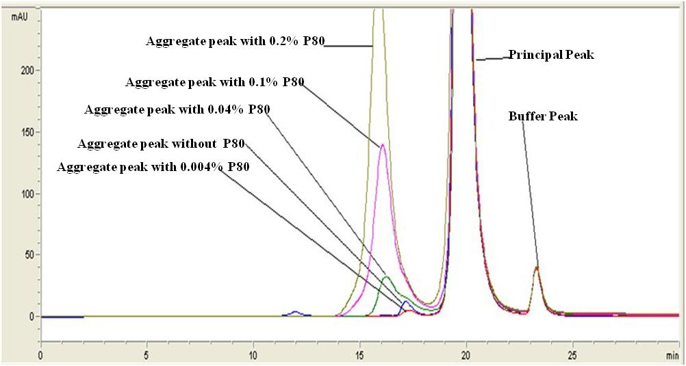 The dimer had a retention time of 20 min whereas oligomer had 16 min. This result showed that higher concentration of polysorbate-80 force the formation of oligomer. The HP-SEC buffers were modified in order to check that if there is any effect of the buffer in formation of oligomer. Ammonium bicarbonate at pH 7.0 was used as (mobile phase). The overlay of chromatogram (Fig. 3) showed that as the concentration of polysorbate-80 increased the amount of aggregate also increased suggesting buffer, component has no role in generation of aggregate.