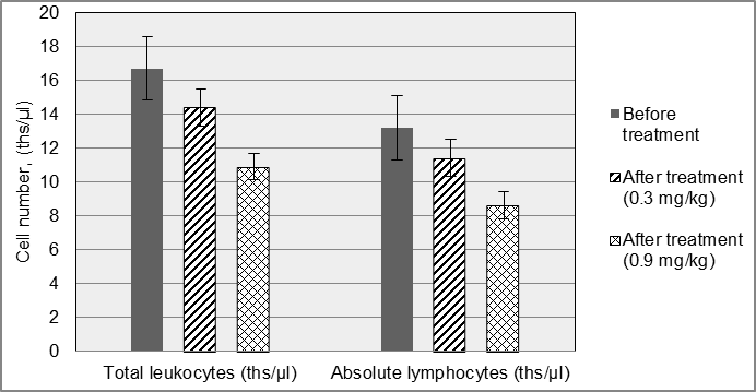 Single intravenous administration of the experimental dose of 0.3 mg/kg, resulted in a slight decrease in the number of white blood cells to 14.4±1.1 ths/µl (13.7% recession) and the absolute number of lymphocytes to 11.4±0.7 ths/µl (13.6% recession). Injection of single high dose (0.9 mg/kg) of the drug accompanied by more pronounced changes in the hematologic parameters, as shown in fig. 1.