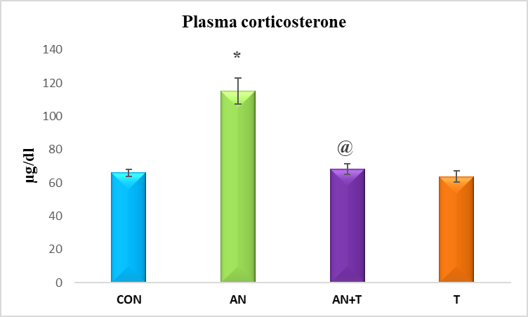 The data were summarized in fig. 1 with mean±SD. The plasma corticosterone level was measured in all the distinct groups. There were significant changes observed in the corticosterone level when compared between control, acute noise stress exposed rats showed a significant increase in the corticosterone level compared to the rest of the groups control treated with M. champaca, and noise exposed rats which received M. champaca showed significant decrease (p<0.05) when compared to stress groups. This indicates M. champaca extract was found to be beneficial.