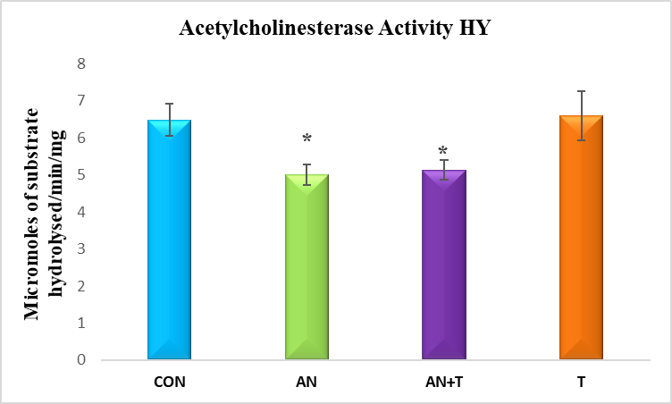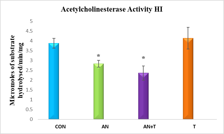 The tissue was homogenized [18] (approximately 20 mg of tissue per ml of phosphate buffer (PH8.0: 0.1M) in a Potter-Elvehjem Homogenizer. A 0.4 ml aliquot of brain homogenate was added to a cuvette containing 2.6 ml of phosphate buffer (pH8.0: 0.1M) 100 μl of DTNB reagent was added to the photocell. The absorbance was measured at 412 nm. Then 0.02 ml of acetyl thiocholine iodide was added. Changes in the absorbance were recorded and the change in absorbance per minute was calculated and 0.1 of esterine sulphate was added to the reaction mixture to determine the nonspecific esterase activity. The difference in the rate of activity was found and the AChE activity was calculated. The enzyme activity was expressed as μ moles of AThI hydrolyzed/min/g tissue.
