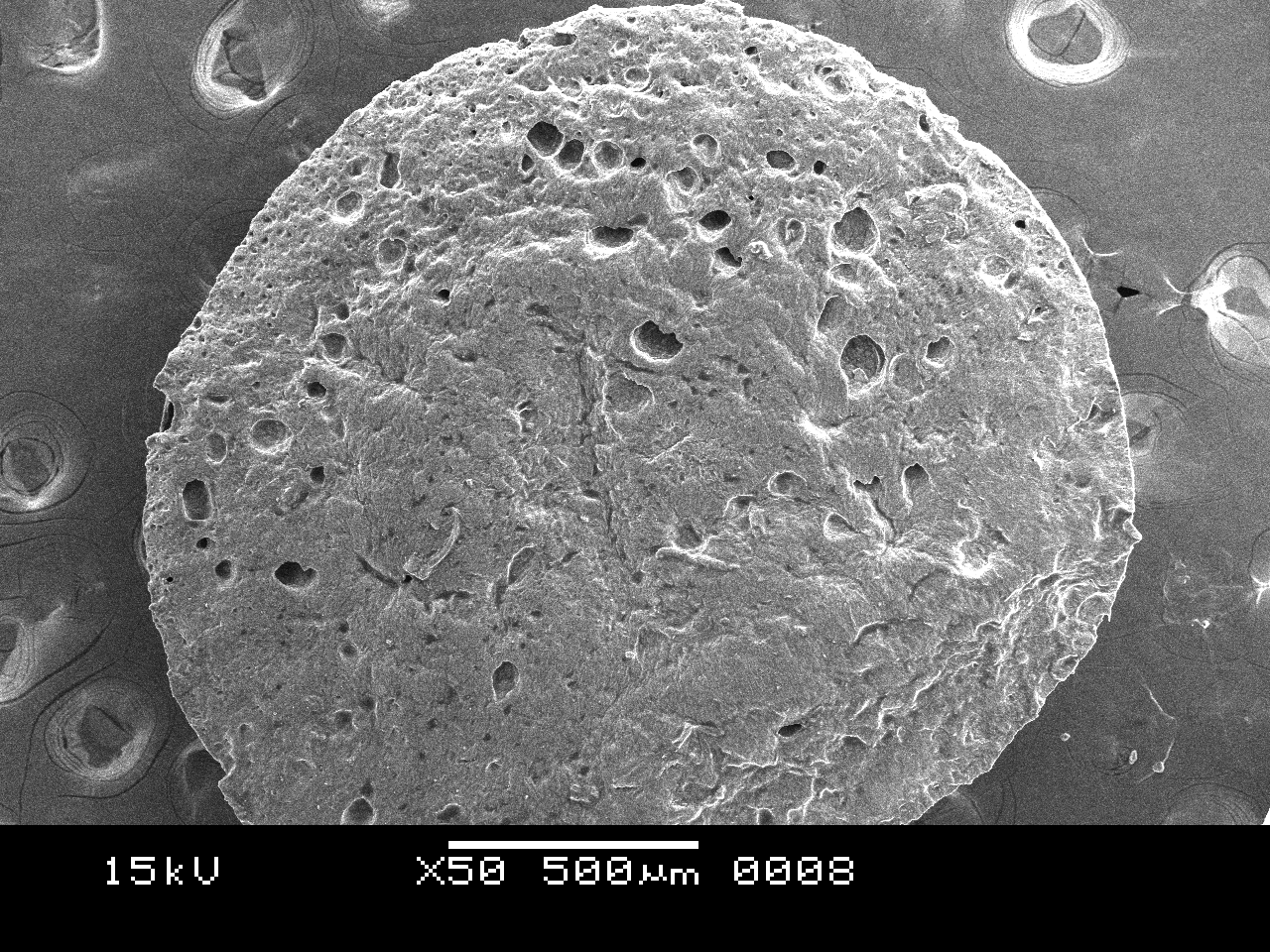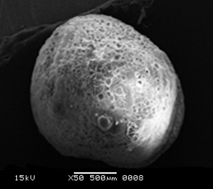 SEM study of alginate beads showed spherical morphology with small pores or minute channels (Fig.3). Small pocket structures (Fig.4) are found on the cross sectional area of the interior part of the beads i. e., matrix of the beads which prove that oil was entrapped in the alginate matrix.