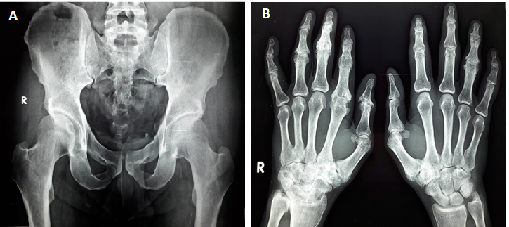 Fig. 1A: Radiograph of sacroiliac joints, subchondral sclerotic changes are seen in bilateral sacroiliac joints with preserved joint space (Grade II Sacroilitis), fig. 1B. radiographs of hand joints. Reduced bone density changes are seen in bilateral hands. Extensive Erosive Arthritis with loss of Joint space with Subchondral Bone Destruction and Sclerotic changes are seen in right 3rd PIP and DIP joints. Ankylosis changes are seen at right 2nd metacarpophalangeal, PIP and DIP joints. Similar ankylosis changes also seen at left 4th PIP Joint. Joint Space narrowing with subchondral sclerosis is seen at right 1st interphalangeal joint, 4th PIP joint with osteophytes formation. Similar changes also were seen at left 2nd, 3rd and 4th PIP and DIP joints. Erosive arthritic changes also were seen at B/l trapeziometacarpal and 2nd carpometacarpal joints with subchondral sclerotic changes joint space narrowing with sclerotic changes is seen at right Intercarpal joints, radioscaphoid joint and distal radioulnar joint