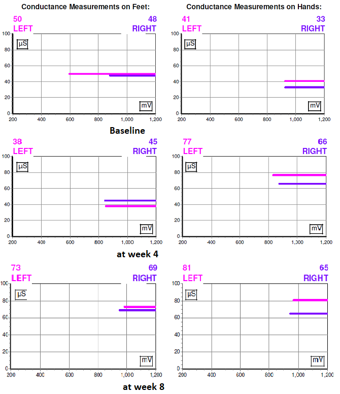 The peripheral sympathetic autonomic function was measured by non-invasive device Sudoscan (Sudoscan Impeto Medical Device, EZS 01750010193 Paris, France) [6]. Sudoscan is a FDA approved device designed to perform the precise evaluation of sweat gland function based on sweat chloride concentrations through reverse iontophoresis and chronoamperometry. Through reverse iontophoresis, the device generates a voltage to the cathode and a current (intensity of around 0.2 mA) between the anode and cathode proportional to chloride concentration. At low voltages (60 μS = no dysfunction; 60–40 μS = moderate dysfunction [6]. Sudomotor function test was performed before the initiation of treatment and after each treatment interval. Sudomotor function test showed marked abnormalities of peripheral sympathetic function (table 1 and fig. 2). No other cause of neuropathy was found from the detailed clinical history, physical examination and biochemical screening (serum vitamin B12 deficiency, Thyroid Function Tests (T3, T4, TSH), fasting blood sugar, HbA1c, HbsAg, Anti-HCV, HIV).