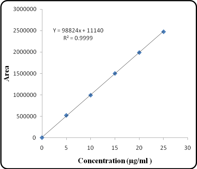 The curve obtained by concentration on x-axis and peak area on y-axis against showed linearity in the concentration range of 5-25 μg/mL of SFX and linearity graph is shown in Graph 1. The regression equation was found to be Y = 98824x + 11140 with correlation coefficient is r2 = 0.9999. The Linearity and statistical analysis of data is shown in Table 5.