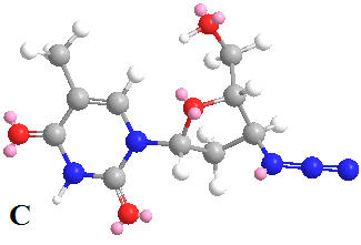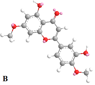 Fig. 1: Ligand 3D structure obtained using ChemDraw 15.0, A): Hesperidin, B): methyl hesperidin, C): zidovudine