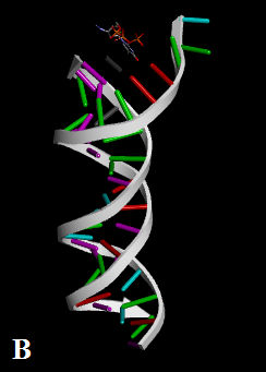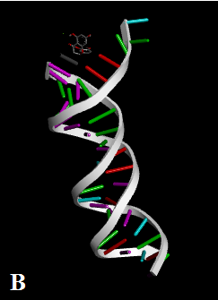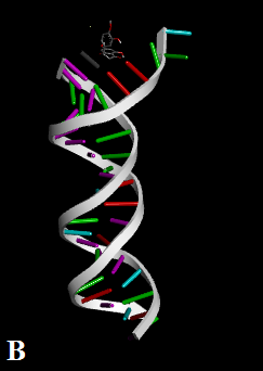 Fig. 4: Visualization of zidovudine-receptor interaction using discovery studio, A): Type of interaction between zidovudine and receptor, B): Zidovudine is in the position of the receptor substrate