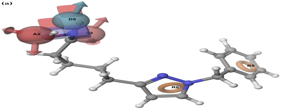 The e-pharmacophoric features were developed for pyrazole analogues against 4BKX and 5ICN HDAC1 proteins. We have predicted for seven pharmacophoric sites, but four pharmacophoric sites were scored against 4BKX while five pharmacophoric features were scored against 5ICN. The pharmacophoric scores and generated corresponding features are described in table 5. These scores of pharmacophoric features revealed that hydrogen bonding of compounds with the receptor at A3 and D5 in both the proteins are important pharmacophores, While R8 in 4BKX based e-pharmacophore and R7 and R8 in 5ICN based e-pharmacophores are essential for the hydrophobic environment (fig. 5).