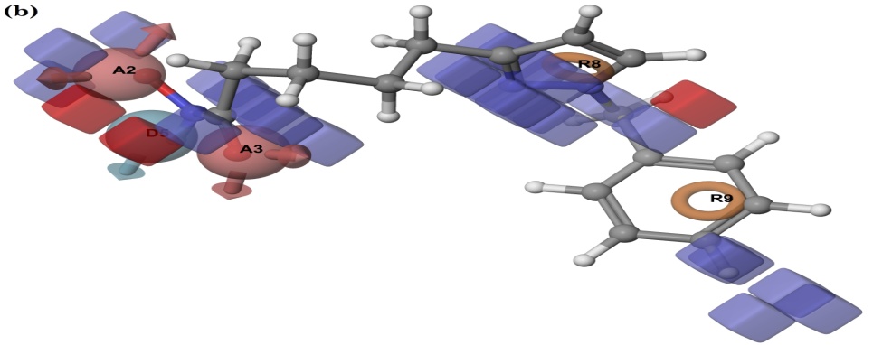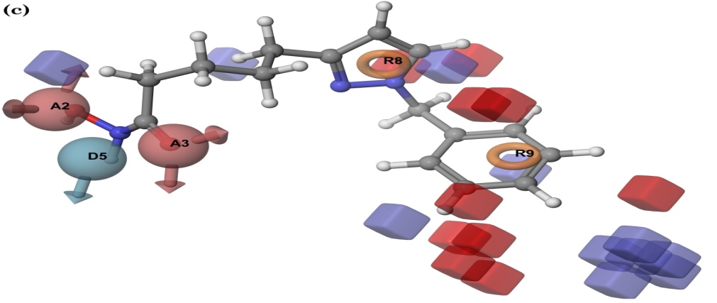 The evaluation of generated 3D-QSAR models was based on the various features, i.e., hydrogen bond donor, hydrogen bond acceptor and hydrophobic character. For the visualization of 3D-QSAR, the favourable and unfavourable features for biological activity has been presented in cube form as depicted in fig. 3(a,b,c). The blue cubes indicated favorable features, while red cube indicated unfavourable features. In the development of 3D-QSAR model, ligand 1 was selected as a training set to the best representation of hydrogen donor, hydrogen bond acceptor, hydrophobic and electronic characteristic predictions features as depicted in fig. 3(a,b,c). In AADRR.356 common pharmacophore hypothesis, the substitution of hydrogen bond donor around the blue region at A3 and A2 position favored the HDAC1 inhibition activity, while H-bond donor around the red region at D5 position unfavored the HDAC1 inhibition activity (fig. 3a). Hydrogen bond acceptor or electron withdrawing group around the blue region at A2, A3, N atoms of pyrazole nucleus of R8 ring and R4 position of R9 ring favored the HDAC1 inhibitory activity (fig. 3b). The replacement of hydrophobic groups near the blue region at R4 position i.e., substitution of C6H5NH, C6H5, C6H5O, C6H5CH2O groups at R4 increased the HDAC1 inhibitory activity, while the substitution around the red region at R3 and R2 positions resulted in decreased HDAC1 inhibitory activity.