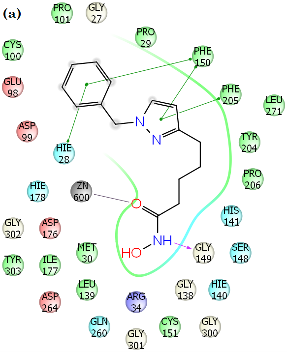 The structures of pyrazole-based SAHA analogs were drawn using ChemDraw Ultra/Chem 3D software, cleaned, optimized and prepared using Ligprep v2.5 (Schrodinger, LLC, New York). This procedure basically involved various sequential steps such as preparation of 3D structures from 2D representation, development of ionization state at pH 7.0±2, elimination of rebellious structures, generation of isomers, the addition of omitted hydrogen atoms and energy minimization by OPLS_2005 force field [17].