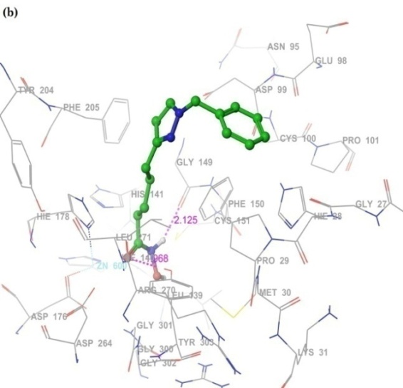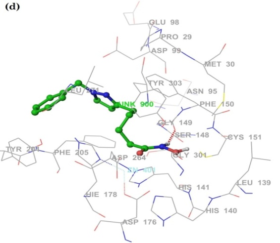 All structures were docked with HDAC1 proteins (PDB ID: 4BKX and 5ICN) for examining the binding mode of compounds for HDAC inhibitory activity. The carbonyl oxygen of hydroxamic acid interacted with zinc atom and NH group interacted with GLY 149 in both the proteins in a similar manner. Compound 1 showed critical hydrophobic interaction with TYR 204 in 5ICN protein [fig. 4(c,d)] while showed hydrophobic interactions with HIE 28, PHE 150 and PHE 205 amino acids in 4BKX protein as reported in various studies [fig. 4(a,b)] [33-35].