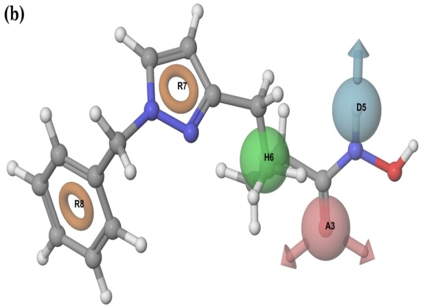Fig. 5: Pharmacophoric features of pyrazole derivatives in (a) 4BKX (b) 5ICN HDAC1 proteins using the e-pharmacophore script. Hydrogen bond acceptor (A3 = pink and D5 = magenta), hydrophobic aromatic rings (R8 and R7 = orange) and Phab En (H6 = green). The graphical representations were obtained using Schrödinger software module
