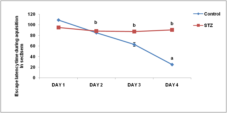 Fig. 1: Effect of STZ (i. c. v) on escape latency time (ELT) during acquisition trials on morris water maze in rats. Each group (n=6) represents mean±standard error of means (SEM), a= p≤ 0.001 Vs. ELT on the first day of the control group, b= p≤ 0.001 Vs. ELT on the same day of the control group. STZ-Streptozotocin