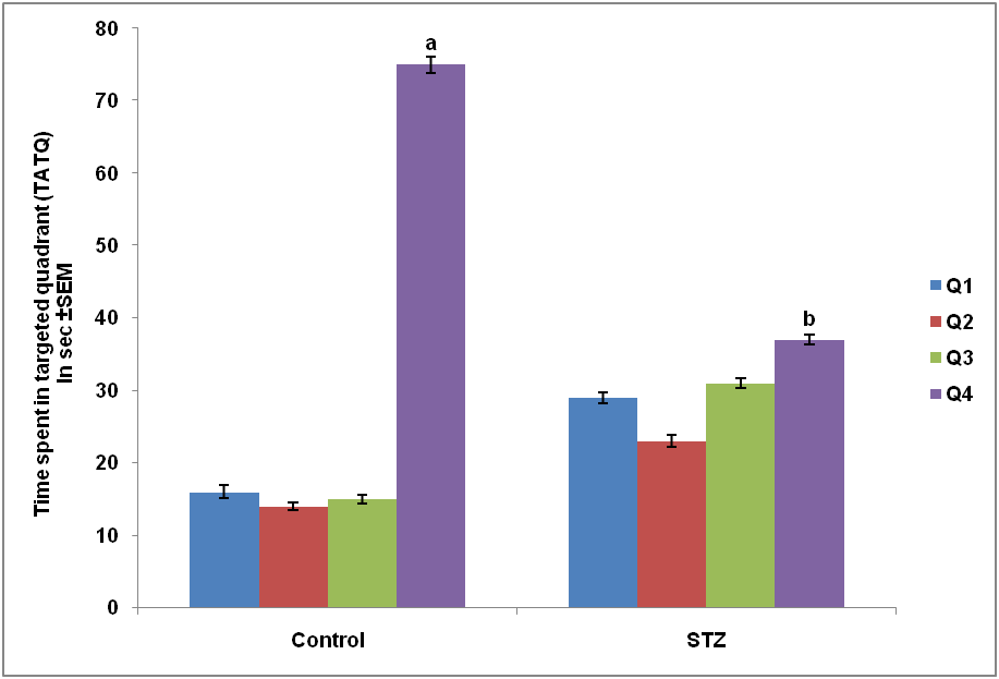 Fig. 2: Effect of STZ (i. c. v) on time spent in the target quadrant (TSTQ) during retrieval trial on morris water maze in rats. Each group (n=6) represents mean±standard error of means (SEM), a= p≤ 0.001 vs. time spent in another quadrant in STZ treated group, b=p≤0.001 vs. time spent in the target quadrant (Q4) of STZ treated group. STZ-Streptozotocin