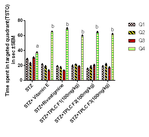 Fig. 4: Effect of Triphala Churna fruits extract on time spent in target quadrant (TSTQ) during retrieval trial in STZ treated rats on morris water maze. Each group (n=6) represents mean±standard error of means (SEM). a= p≤ 0.001 vs. time spent in another quadrant in STZ treated group, b=p≤0.001 vs. time spent in target quadrant (Q4) of STZ treated group. STZ-Streptozotocin, TPLC-Triphala Churna, F1-Formulation 1, F2-Formulation 2, F3-Formulation 3