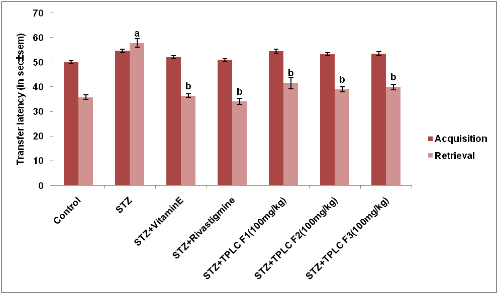 Fig. 5: Effect of Triphala Churna fruits extract on transfer latency (TL) of streptozotocin-treated rats on elevated plus maze (acquisition and retrieval in sec±SEM). Each group (n=6) represents mean±standard error of means (SEM), a= P≤0.001 Vs control group, b=P≤0.001 Vs STZ treated group. STZ-Streptozotocin, TPLC-Triphala Churna, F1-Formulation 1, F2-Formulation 2, F3-Formulation 3