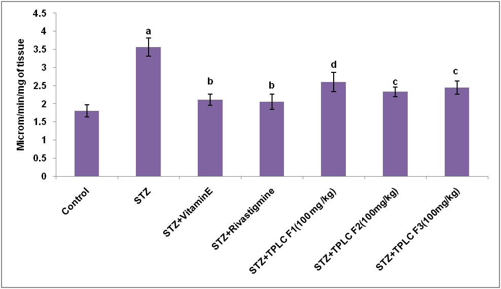 Treatment with streptozotocin showed significant (P≤0.001) increase in brain AchE activity when compared to control group. The rats were treated with Vitamin E and Rivastigmine showed significant (P≤0.001) decrease in AchE activity when compared to streptozotocin treated group, whereas a significant (P≤0.01) decrease in AchE activity was observed in the TPLC F3 and TPLC F2 treated group. TPLC F1 group showed low significance at P≤0.05 while compared to the STZ treated group (fig. 6).