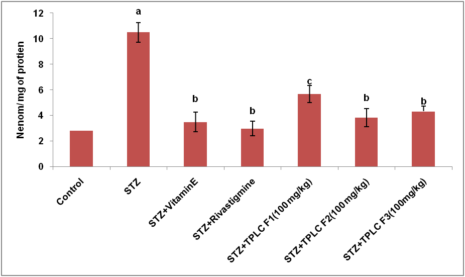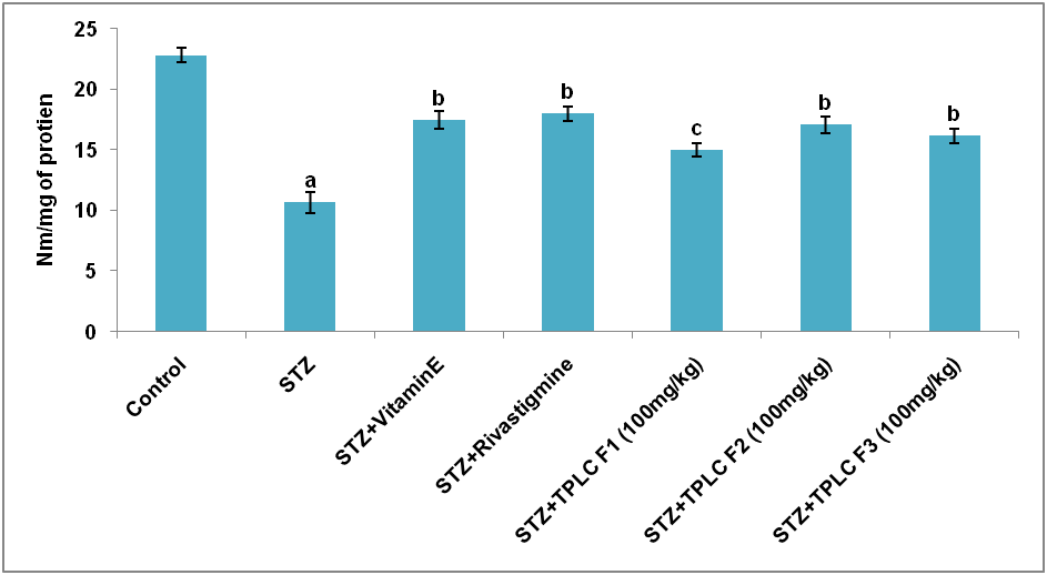 Lipid peroxidation study showed that streptozotocin treated group showed significant (P≤0.001) increase in MDA level when compared to control group. Standard (Vitamin E and Rivastigmine) and TPLC F2, TPLC F3 treated group were able to prevent the elevated MDA level, showed significant at (P≤0.001) and TPLC F1 showed significance at (P≤0.01) decrease in MDA level when compared to streptozotocin treated group (fig. 7).