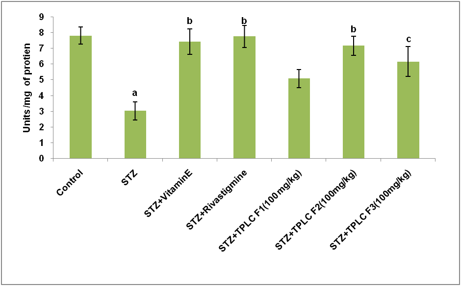 Streptozotocin-treated group showed significant (P≤0.001) decrease in SOD level when compared with control group. Whereas, standard (Vitamin E and Rivastigmine) treated showed significant (P≤0.001) increase in activity of SOD level when compared to streptozotocin treated group. In another hand TPLC F2 and TPLC F3 treated group showed significant (P≤0.001, P≤0.01) increase in SOD level when compared to the standard treated group but results are not better than standard treated group (fig. 9).