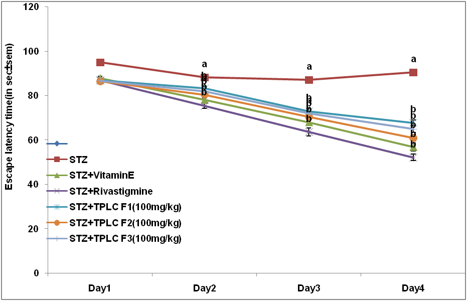 Fig. 3: Effect of Triphala Churna fruits extract on escape latency of streptozotocin-treated rats on morris water maze (1-4 d) in sec. Each group (n=6) represents mean±standard error of means (SEM), a= p≤ 0.001 vs. ELT on the first day of STZ (i. c. v) treated group, b=p≤0.001 vs. ELT of STZ (i. c. v) treated group. STZ-Streptozotocin, TPLC-Triphala Churna, F1-Formulation 1, F2-Formulation 2, F3-Formulation 3