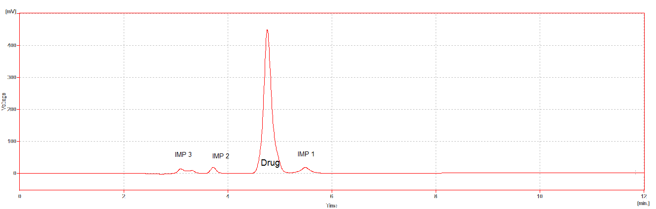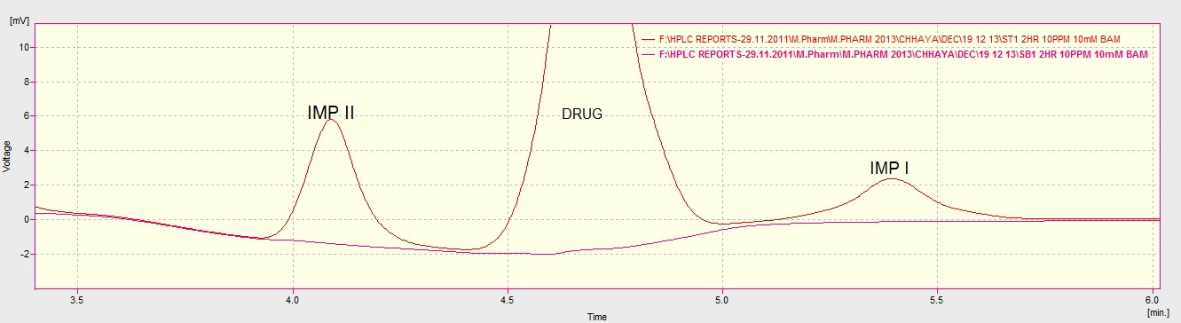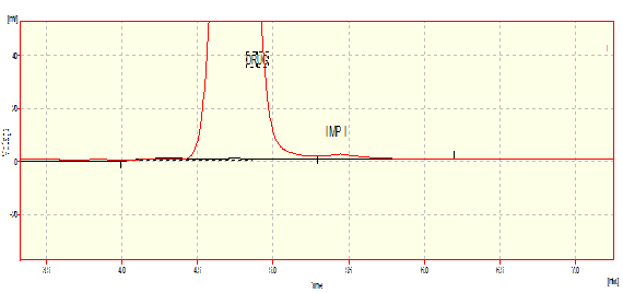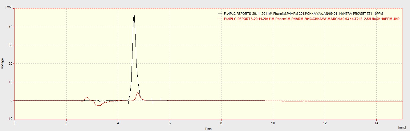 The results from the stress testing studies indicate the method is highly specific for NEPA. Degradation products were completely distinguishable from the parent compound. The drug undergoes significant degradation under acid, alkaline and oxidative condition. Acidic degradation was faster than basic & oxidative degradation. Acid hydrolysis resulted in complete degradation of NEPA. Little degradation was observed in photolysis. The drug was relatively stable in thermal & relative humidity, dry heat and wet heat degradation. Three degradation products were obtained at Rt of 3.3, 4.0 & 5.3. And some additional peaks are at 6.3 & 9.1. During experiments, it was found that NEPA Drug has inherent impurity at RT 5.29(Fig.2) that increases in stressed conditions and is common in all degradation condition. The typical chromatograms from assay of stressed samples are shown in Fig.3.