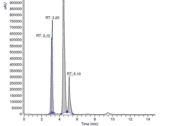 A detection wavelength 238 nm was selected from the full range UV spectral data due to its high sensitivity for all degradation products and minimal difference in response factors. NEPA having pKa (SA) 15.82 and pKa (SB) 1.83, pH 4.0 buffer was selected to enable better column performance. Isocratic run was accessed using mobile phase 10 mM Ammonium formate buffer pH 4.0: ACN: MeOH (45:27.5:27.5) (v/v/v) on C8 and C18 columns. The C8 column provided the highest number of peaks and better resolution. Thus, further experiments were carried out using anOlyster C8 column.