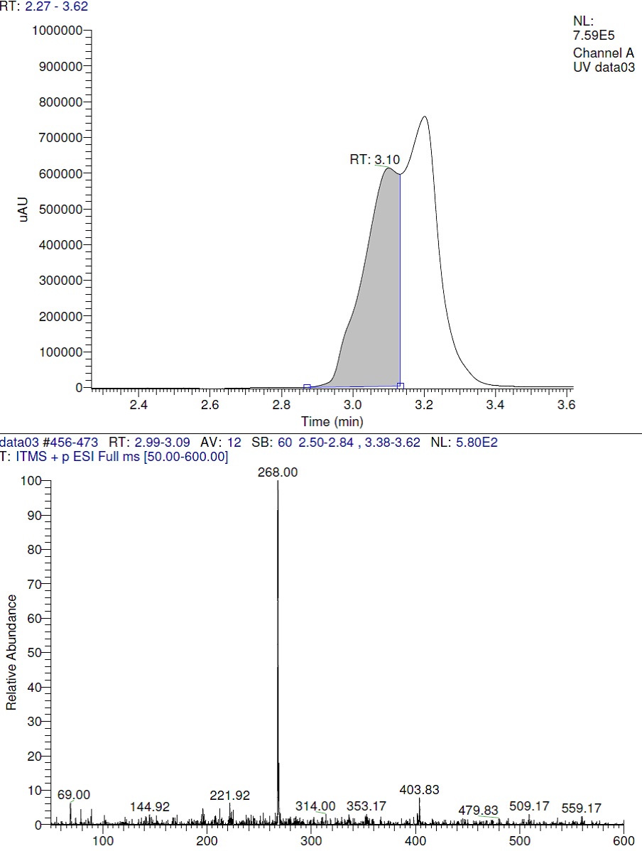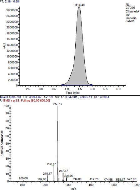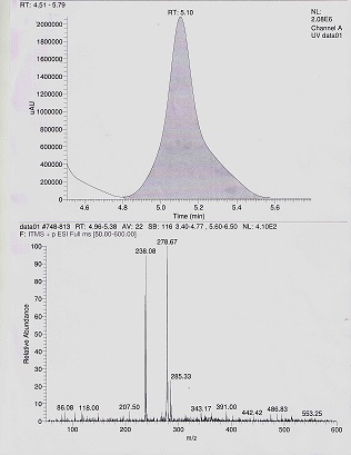 An LC–MS system (Thermo Scientific, Sunnyvale, CA, USA) comprised of a LCQ Fleet Ion Trap Mass Spectrometer. The analysis was performed in positive electro-spray/positive ionization mode with an ion source voltage of 5000 V and a source temperature of 4500C. The curtain gas flow was 20 psi. The data was collected and processed using Surveyor plus HPLC System with Qual browser software. Column, mobile phase, flow rate and column temperature were same as in HPLC-UV.