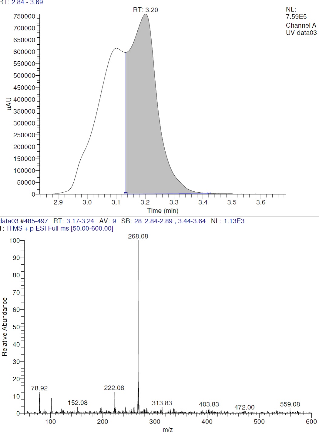 In acidic hydrolysis degradants peaks were obtained at RT of 3.3, 3.4 & 5.3 min on heating. In basic hydrolysis & oxidative additional degradants peaks were obtained at RT of 4.0 & 5.3 min apart from drug peak. Overall NEPA degradants peaks were observed at RT of 3.3, 3.4, 4.0, 4.9 5.3, 6.3, 9.1. The MS data shows that bifurcated peak at 3.3 & 3.4 have same m/z & fragment at 268 & 222.08 respectively. This indicates the presence of enantiomer. Results of forced degradation study are summarized in table 2.
